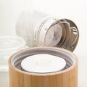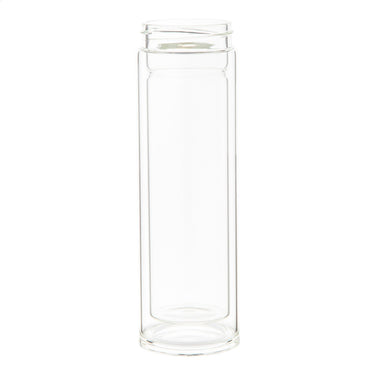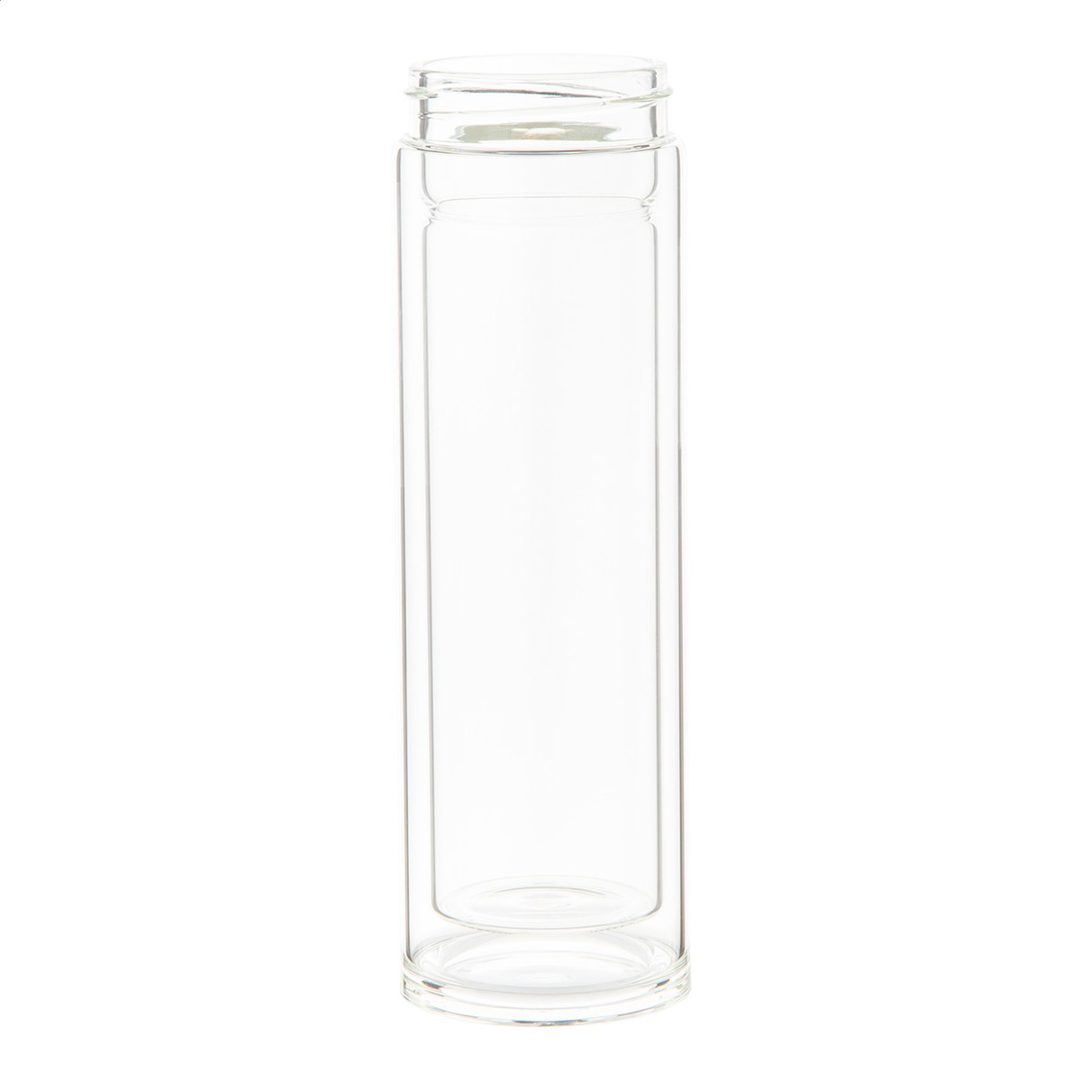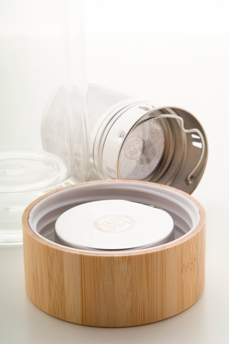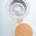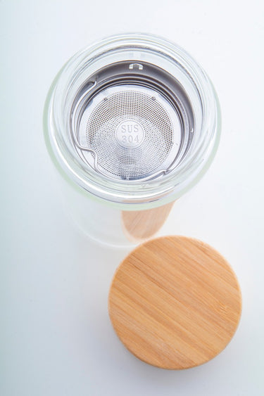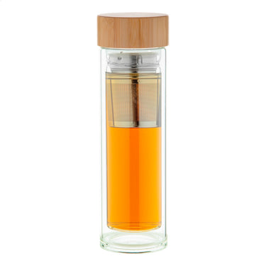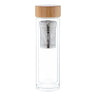 Dvoustěnná, izolovaná láhev z borosilikátového skla s čajovým spařovačem a bambusovým víčkem. 420 ml.